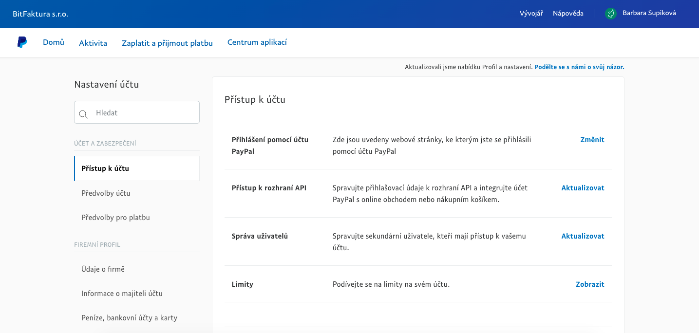 - Ve Vašem panelu PayPal přejděte na Váš profil a stiskněte tlačítko Nastavení účtu