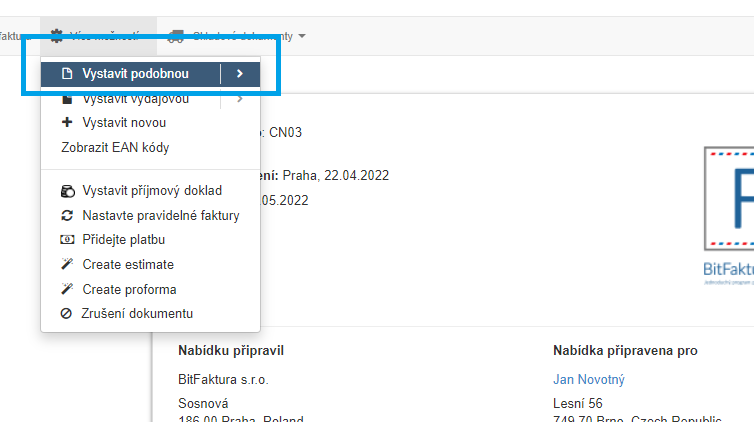Pro vystavení dokladu se nejprve ujistěte, že je daný typ dokladu spuštěn v sekci Další dokumenty k vystavení. Chcete-li to provést, přejděte do nabídky Nastavení> Nastavení účtu a zaškrtněte políčko Cenová nabídka. Po zaškrtnutí políčka klikněte na Uložit ve spodní části stránky.Vystavení dokladu